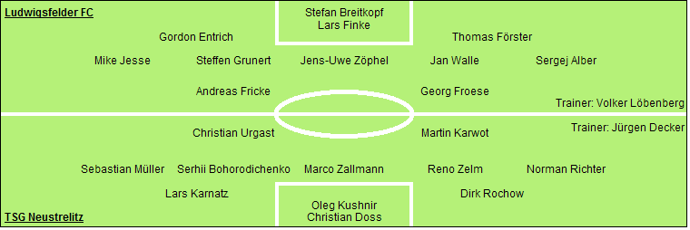 Ludwigsfelder FC: Stefan Breitkopf - Lars Finke (27. Thomas Welskopf) - Gordon Entrich, Thomas Förster - Mike Jesse, Steffen Grunert, Jens-Uwe Zöphel, Jan Walle, Sergej Alber - Andreas Fricke (46. Jens Neumann), Georg Froese (71. Nicky Röll)
