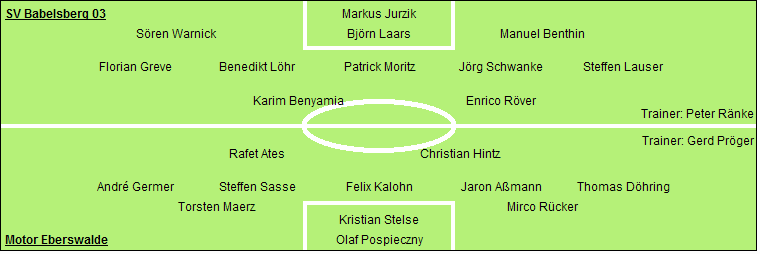 SV Babelsberg 03: Markus Jurzik - Sören Warnick (84. Andreas Lücke), Björn Laars, Manuel Benthin - Florian Greve, Benedikt Löhr, Patrick Moritz, Jörg Schwanke (66. Yuzuru Okuyama), Steffen Lauser - Karim Benyamia, Enrico Röver (66. Hendryk Lau)