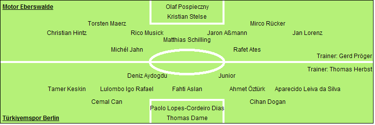 Motor Eberswalde: Olaf Pospieczny - Kristian Stelse - Torsten Maerz, Mirco Rücker - Christian Hintz (36. Frank Ploen), Rico Musick, Jaron Aßmann, Jan Lorenz - Matthias Schilling - Michél Jahn (76. Christian Schlegel), Rafet Ates