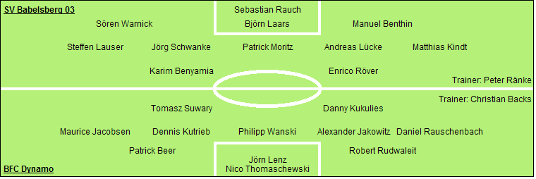 SV Babelsberg 03: Sebastian Rauch - Sören Warnick, Björn Laars, Manuel Benthin - Steffen Lauser (83. Hendryk Lau), Jörg Schwanke, Patrick Moritz (83. Florian Greve), Andreas Lücke, Matthias Kindt - Karim Benyamia (46. Yuzuru Okuyama), Enrico Röver