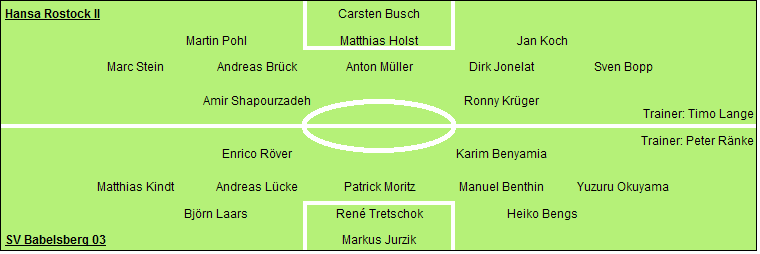 Hansa Rostock II: Carsten Busch - Martin Pohl, Matthias Holst (72. Marcus Rabenhorst), Jan Koch - Marc Stein, Andreas Brück, Anton Müller (77. Fiete Sykora), Dirk Jonelat, Sven Bopp - Amir Shapourzadeh (84. Kevin Hansen), Ronny Krüger