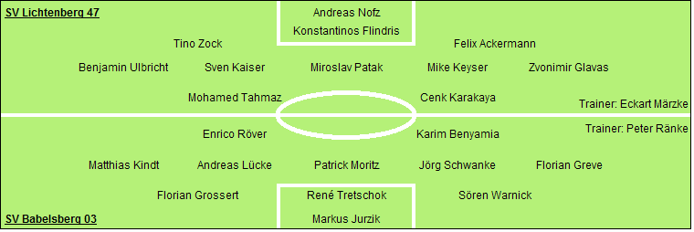 SV Lichtenberg 47: Andreas Nofz - Konstantinos Flindris - Tino Zock, Felix Ackermann - Benjamin Ulbricht, Sven Kaiser, Miroslav Patak (90. Tim Schreckenbach), Mike Keyser, Zvonimir Glavas - Mohamed Tahmaz (34. Norbert Gronwald), Cenk Karakaya