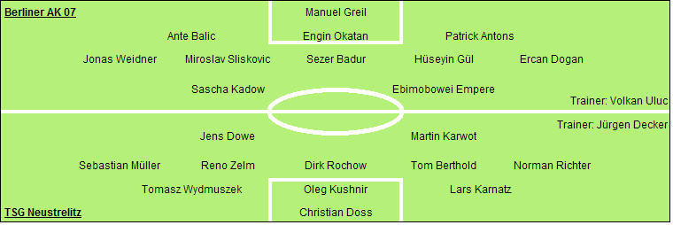 Berliner AK 07: Manuel Greil - Ante Balic (61. Yahya Yaya), Engin Okatan, Patrick Antons - Jonas Weidner, Miroslav Sliskovic, Sezer Badur, Hüseyin Gül, Ercan Dogan - Sascha Kadow, Ebimobowei Empere (71. Levent Demiray)