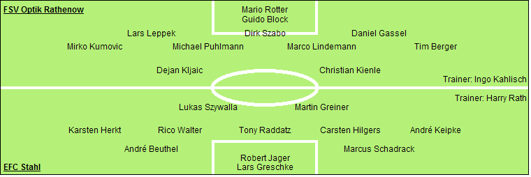 FSV Optik Rathenow: Mario Rotter - Guido Block - Lars Leppek, Dirk Szabo, Daniel Gassel (71. Steffen Senf) - Mirko Kumovic, Michael Puhlmann, Marco Lindemann, Tim Berger - Dejan Kljaic (85. Soeren Osterland), Christian Kienle