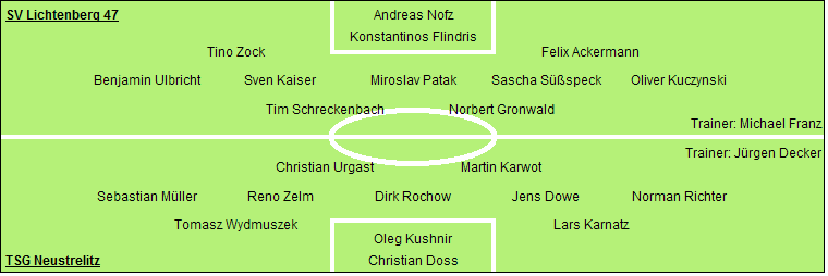 SV Lichtenberg 47: Andreas Nofz - Konstantinos Flindris - Tino Zock, Felix Ackermann - Benjamin Ulbricht, Sven Kaiser, Miroslav Patak (73. Cenk Karakaya), Sascha Süßspeck, Oliver Kuczynski (81. Robert Kayser) - Tim Schreckenbach, Norbert Gronwald