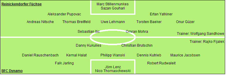 Reinickendorfer Füchse: Marc Stillenmunkes - Sazan Gouhari - Aleksander Pupovac, Ertan Yatkiner - Andreas Nitsche (67. Vittorio Mattera-Iacono), Thomas Breitfeld, Uwe Lehmann, Torsten Baeker, Onur Güzer (73. Patrick Kroll) - Sebastian Ilic, Omran Mohra (64. Thomas Brechler)