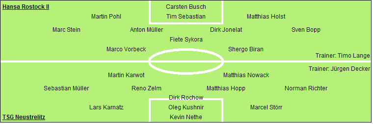 Hansa Rostock II: Carsten Busch - Martin Pohl, Tim Sebastian, Matthias Holst - Marc Stein, Anton Müller (63. Ronny Krüger), Dirk Jonelat (78. Marcus Rabenhorst), Sven Bopp (78. Jan Koch) - Fiete Sykora - Marco Vorbeck, Shergo Biran