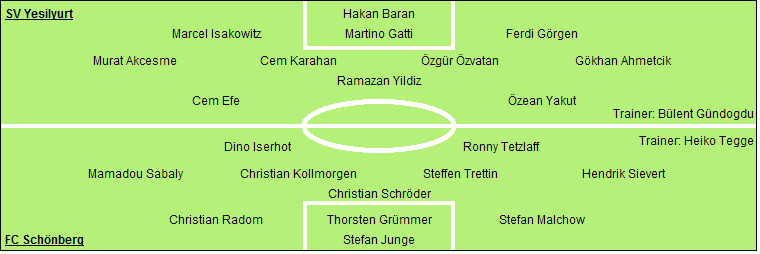 SV Yesilyurt: Hakan Baran - Marcel Isakowitz, Martino Gatti, Ferdi Görgen (46. Momar Njie) - Murat Akcesme, Cem Karahan, Özgür Özvatan (46. Robert Pocrnic), Gökhan Ahmetcik (60. Aziz Bozkurt) - Ramazan Yildiz - Cem Efe, Özean Yakut