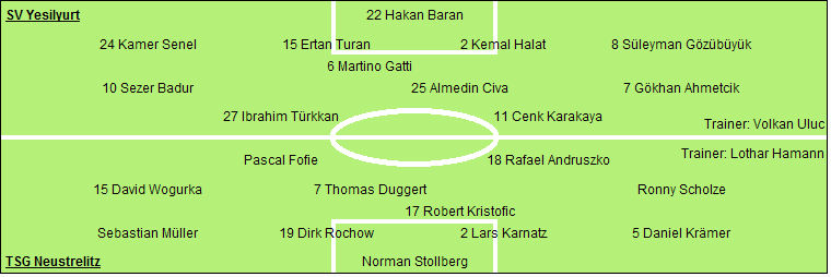 SV Yesilyurt: Hakan Baran - Kamer Senel, Ertan Turan, Kemal Halat, Süleyman Gözübüyük - Martino Gatti - Sezer Badur, Almedin Civa, Gökhan Ahmetcik - Ibrahim Türkkan (82. Umut Cinar), Cenk Karakaya (85. Metin Oguz)