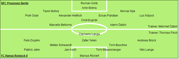 BFC Preussen Berlin: Roman Görtz - Amir Mohra - Tarek Mohra, Momar Njie - Piotr Orzel, Alexander Helfrich, Ersan Parlatan, Luc Ndjock (87. Andreas Nitsche) - Ümit Ergirdir - Marcello Bellomo (70. Soner Kilic), Adem Öztürk
