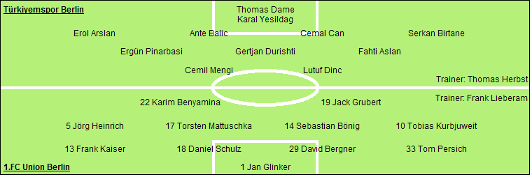 Türkiyemspor Berlin: Thomas Dame - Karal Yesildag - Erol Arslan, Ante Balic, Cemal Can, Serkan Birtane - Ergün Pinarbasi, Gertjan Durishti, Fahti Aslan - Cemil Mengi (90. Tamer Keskin), Lutuf Dinc (55. Deniz Aydogdu)
