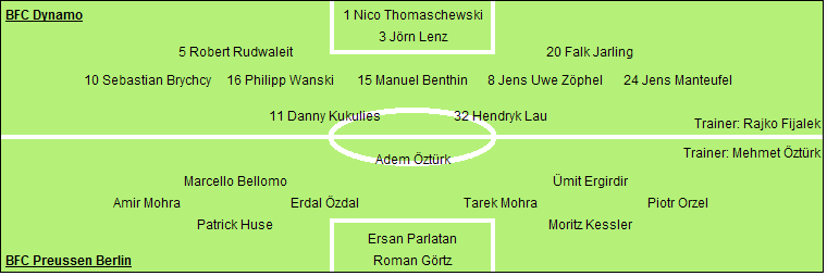 BFC Preussen Berlin: Roman Görtz - Ersan Parlatan - Moritz Kessler, Patrick Huse - Piotr Orzel, Tarek Mohra (46. Christopher Stettner), Erdal Özdal, Amir Mohra - Ümit Ergirdir, Marcello Bellomo (67. Alexander Helfrich) - Adem Öztürk (80. Soner Kilic)