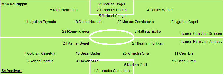 MSV Neuruppin: Marian Unger - Maik Neumann, Thomas Boden, Tobias Weber - Michael Seeger - Krystian Prymula, Denis Novacic, Markus Zschiesche, Ugurtan Cepni (82. Julian Geils) - Ronny Krüger (70. Kenny Dittrich), Matthias Balke (77. Martin Weller)