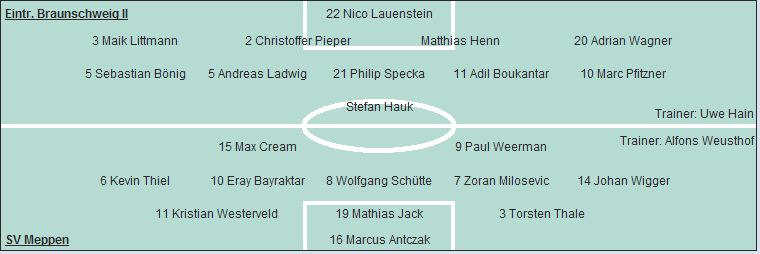 Eintracht Braunschweig II: Nico Lauenstein - Maik Littmann, Christoffer Pieper, Matthias Henn, Adrian Wagner - Sebastian Bönig (70. Rick Latus), Andreas Ladwig, Philip Specka (60. Morsi Barkallah), Adil Boukantar, Marc Pfitzner - Stefan Hauk (46. Jan Washausen)