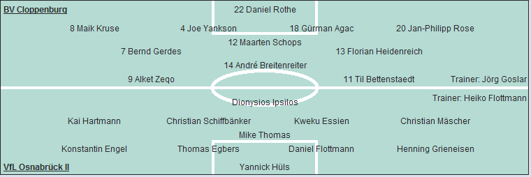 VfL Osnabrück II: Yannick Hüls - Henning Grieneisen, Daniel Flottmann, Thomas Egbers, Konstantin Engel - Mike Thomas - Christian Mäscher, Kweku Essien, Christian Schiffbänker, Kai Hartmann - Dionysios Ipsilos (71. Viktor Braininger)
