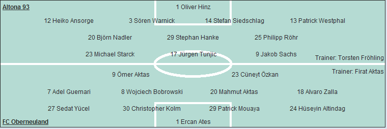 Altona 93: Oliver Hinz - Heiko Ansorge (80. Kadir Candir), Sören Warnick, Stefan Siedschlag, Patrick Westphal - Björn Nadler, Stephan Hanke, Philipp Röhr - Michael Starck (45. Stefan Richter), Jürgen Tunjic, Jakob Sachs (86. Kay Bastian Göttsch)