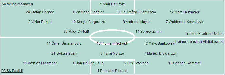 FC St. Pauli II: Benedikt Pliquett - Sascha Rammel, Tim Petersen, Jan-Philipp Kalla, Mathias Hinzmann - Marius Browarczyk (83. Christoph Pfützenreuter), Farai Mbidzo, Gökan Iscan (78. Serhat Yapici) - Mirko Jankowski (55. Christopher Mahrt), Roman Prokoph, Ömer Sismanoglu