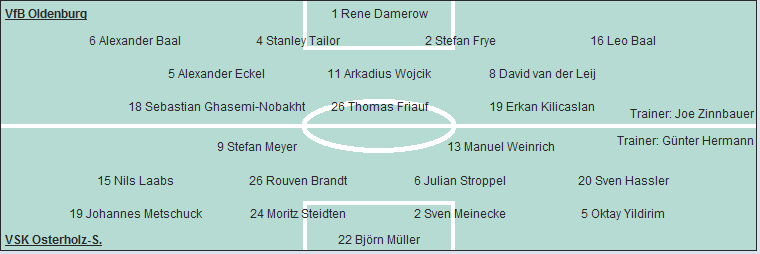 VfB Oldenburg: Rene Damerow - Alexander Baal, Stanley Tailor, Stefan Frye, Leo Baal - Alexander Eckel, Arkadius Wojcik, David van der Leij (87. Christian Thölking) - Sebastian Ghasemi-Nobakht (83. Steven Janßen), Thomas Friauf (60. Marcel Salomo), Erkan Kilicaslan