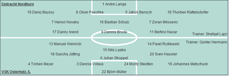 VSK Osterholz-S.: Björn Müller - Johannes Metschuck (46. Rouven Brandt), Moritz Steidten, Dennis Votava, Torben Meyer (76. Gentjan Muca) - Julian Stroppel - Sven Hassler, Sascha Jütting (60. Yasin Bilgin) - Nils Laabs - Pavel Rydlewski, Manuel Weinrich