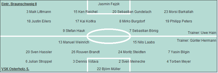 VSK Osterholz-S.: Björn Müller - Torben Meyer, Sven Meinecke, Dennis Votava, Julian Stroppel - Yasin Bilgin (46. Pavel Rydlewski), Moritz Steidten, Rouven Brandt (80. Johannes Metschuck), Sven Hassler - Nils Laabs, Manuel Weinrich (64. Sascha Jütting)