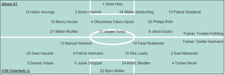 Altona 93: Oliver Hinz - Heiko Ansorge, Sören Warnick, Stefan Siedschlag, Patrick Westphal - Benny Hoose, Ofosuhene Oduro-Opuni (81. Thomas Kristensen), Philipp Röhr - Stefan Richter (74. Oliver Kunkel), Jürgen Tunjic, Jakob Sachs (90. Stephan Hanke)