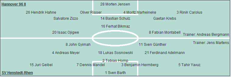 Hannover 96 II: Morten Jensen - Hendrik Hahne, Oliver Risser (46. Tim Hofmann), Moritz Marheineke, Rinik Carolus - Salvatore Zizzo, Bastian Schulz, Gaetan Krebs (64. Daniel Stendel) - Ferhat Bikmaz (64. Ali Moslehe) - Isaac Ojigwe, Fabian Montabell