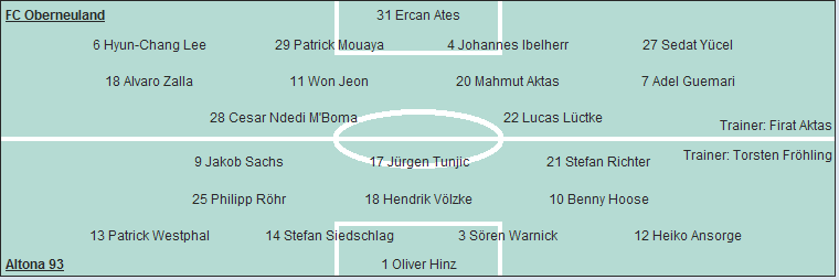 FC Oberneuland: Ercan Ates - Hyun-Chang Lee, Patrick Mouaya, Johannes Ibelherr, Sedat Yücel (80. Hüseyin Altindag) - Alvaro Zalla, Won Jeon, Mahmut Aktas, Adel Guemari - Cesar Ndedi M'Boma (21. Ömer Aktas), Lucas Lüctke (70. Mike Barten)