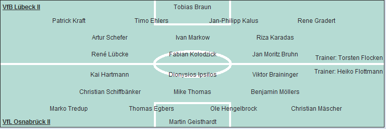 VfB Lübeck II: Tobias Braun - Patrick Kraft, Timo Ehlers, Jan-Philipp Kalus, Rene Gradert (49. Naim Osmani) - Artur Schefer, Ivan Markow, Riza Karadas - René Lübcke, Fabian Kolodzick, Jan Moritz Bruhn
