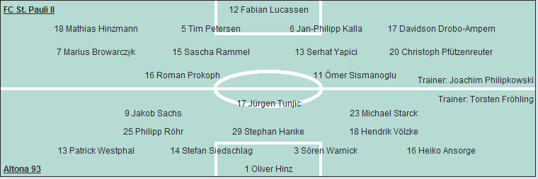 FC St. Pauli II: Fabian Lucassen - Mathias Hinzmann, Tim Petersen, Jan-Philipp Kalla, Davidson Drobo-Ampem - Marius Browarczyk, Sascha Rammel (46. Abdul Yilmaz), Serhat Yapici (60. Gökan Iscan), Christoph Pfützenreuter (75. Mirko Jankowski) - Roman Prokoph, Ömer Sismanoglu