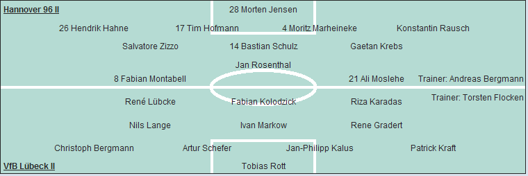 Hannover 96 II: Morten Jensen - Hendrik Hahne, Tim Hofmann, Moritz Marheineke, Konstantin Rausch - Salvatore Zizzo, Bastian Schulz, Gaetan Krebs (79. Rinik Carolus) - Jan Rosenthal (66. Ferhat Bikmaz) - Fabian Montabell, Ali Moslehe (85. Jaroslaw Lindner)