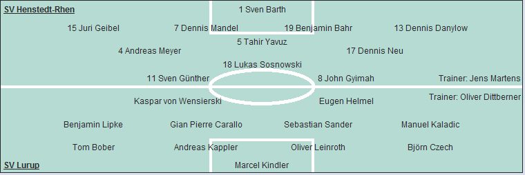 SV Lurup: Marcel Kindler - Björn Czech, Oliver Leinroth, Andreas Kappler, Tom Bober (46. Loic Gerard) - Manuel Kaladic, Sebastian Sander, Gian Pierre Carallo, Benjamin Lipke - Eugen Helmel, Kaspar von Wensierski (65. Tobias Leuthold)