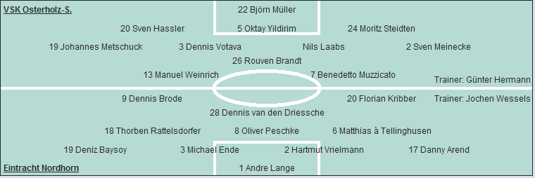 VSK Osterholz-S.: Björn Müller - Sven Hassler, Oktay Yildirim, Moritz Steidten - Johannes Metschuck, Dennis Votava, Nils Laabs, Sven Meinecke (46. Lucas Buchwald, 75. Patrick Hermann) - Rouven Brandt - Manuel Weinrich (70. Torben Meyer), Benedetto Muzzicato