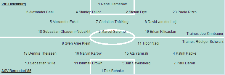 VfB Oldenburg: Rene Damerow - Alexander Baal, Stanley Tailor, Stefan Frye, Paolo Rizzo - Alexander Eckel (64. Thomas Friauf), Christian Thölking, David van der Leij - Sebastian Ghasemi-Nobakht (64. Stanislaw Puschkaruk), Marcel Salomo, Erkan Kilicaslan (79. Mehmet Koc)