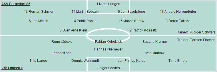 ASV Bergedorf 85: Mirko Langen - Roman Schmer, Martin Sobczyk, Jan Savelsberg, Angelo Herrendörfer (18. Dennis Theissen) - Jan Melich, Patrik Papke, Marvin Karow, Deran Toksöz (87. Sebastian Wille) - Sven Arne Klein, Patrick Kossatz