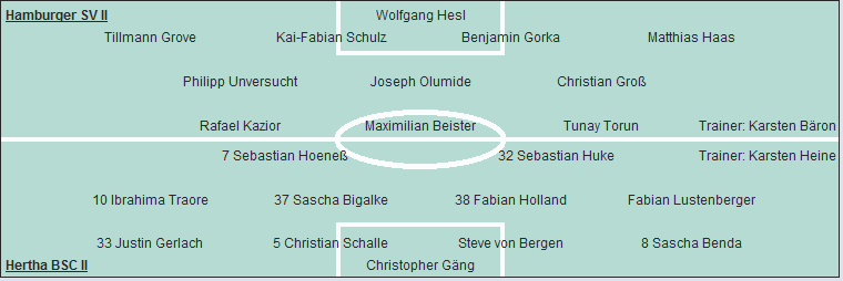 Hertha BSC II: Christopher Gäng - Sascha Benda, Steve von Bergen, Christian Schalle, Justin Gerlach - Fabian Lustenberger (65. Yannick Agro), Fabian Holland, Sascha Bigalke (79. Shervin Radjabali-Fardi), Ibrahima Traore - Sebastian Huke (46. Malick Bolivard), Sebastian Hoeneß