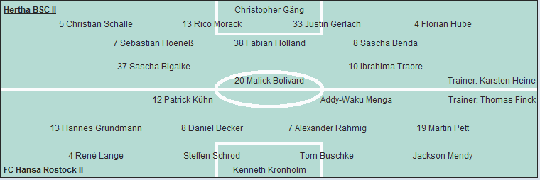 Hertha BSC II: Christopher Gäng - Christian Schalle, Rico Morack, Justin Gerlach, Florian Hube - Sebastian Hoeneß, Fabian Holland, Sascha Benda - Sascha Bigalke (61. Shervin Radjabali-Fardi), Ibrahima Traore - Malick Bolivard (83. Ellis McLoughlin, 86. Yannick Agro)
