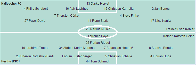 Hertha BSC II: Tom Schmidt - Florian Hube, Christian Schalle, Fabian Lustenberger, Shervin Radjabali-Fardi - Sascha Benda, Sebastian Hoeneß (84. Rico Morack), Abdoul Karim Martens, Ibrahima Traore - Florian Riedel - Terrence Boyd
