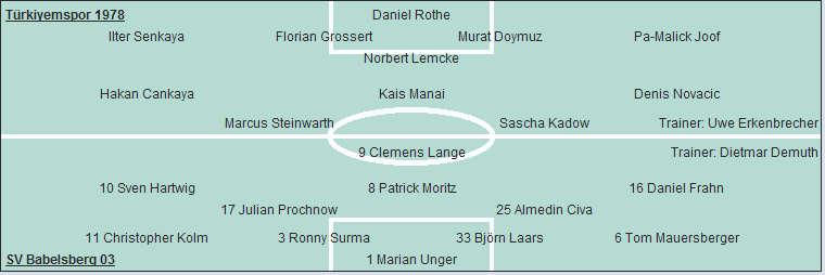 Türkiyemspor 1978: Daniel Rothe - Ilter Senkaya, Florian Grossert, Murat Doymuz, Pa-Malick Joof - Norbert Lemcke (46. Süleyman Koc) - Hakan Cankaya, Kais Manai (80. Cihan Dogan), Denis Novacic - Marcus Steinwarth, Sascha Kadow (66. Astrit Selanci)