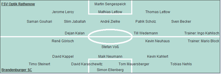 FSV Optik Rathenow: Martin Sengespeick - Jerome Leroy, Mathias Lettow, Thomas Lettow (73. Michael Puhlmann) - Saman Gouhari (90. Marco Jahn), Slim Jaballah, André Zielke, Patrik Scholz, Sven Becker - Dejan Kalan (73. Daniel Pfefferkorn), Till Wedemann
