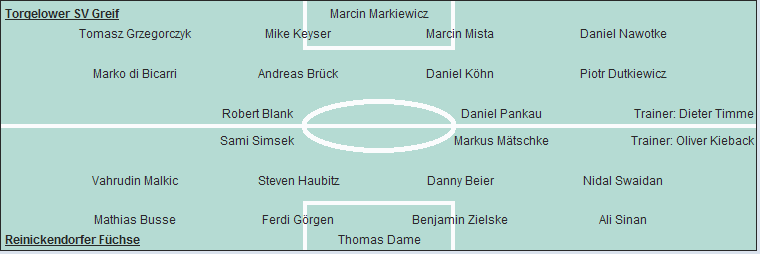 Torgelower SV Greif: Marcin Markiewicz - Tomasz Grzegorczyk, Mike Keyser, Marcin Mista, Daniel Nawotke - Marko di Bicarri, Andreas Brück, Daniel Köhn, Piotr Dutkiewicz (57. Michael Freyer) - Robert Blank (46. Christian Gude, 55. Robert Jager), Daniel Pankau