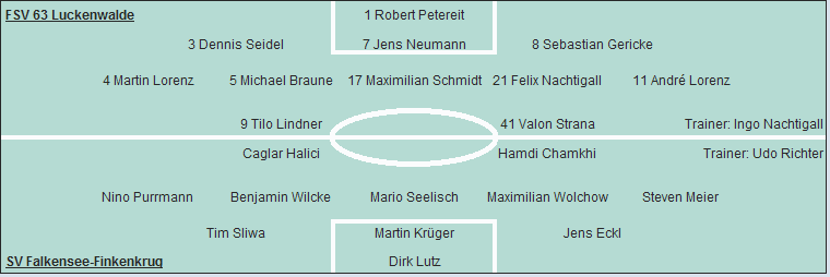 FSV 63 Luckenwalde: Robert Petereit - Dennis Seidel, Jens Neumann, Sebastian Gericke - Martin Lorenz, Michael Braune, Maximilian Schmidt, Felix Nachtigall, André Lorenz (44. Jan Walle) - Tilo Lindner (57. Tobias Dittmann), Valon Strana (34. Benjamin Dowall)