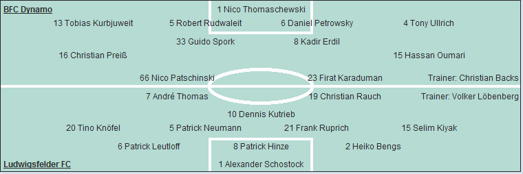 BFC Dynamo: Nico Thomaschewski - Tobias Kurbjuweit, Robert Rudwaleit, Daniel Petrowsky, Tony Ullrich - Guido Spork, Kadir Erdil - Christian Preiß, Hassan Oumari (46. Max Gerhard) - Nico Patschinski, Firat Karaduman (64. Danny Kukulies)