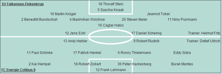 FC Energie Cottbus II: Frank Lehmann - Burak Mentes, Peter Hackenberg, Robert Zickert, Kai Hempel - Eddy Sidra (67. Patrick Richter), Ronny Thielemann, Patrick Henkel (76. Kyle Porter), Paul Schinke - Robert Rudnik (58. Gagandeep Dosanjh), Andy Hebler