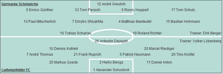 Ludwigsfelder FC: Alexander Schostock - Daniel Anton, Heiko Bengs, Markus Goede - Tino Knöfel, Patrick Neumann, Frank Ruprich (29. Selim Kiyak), André Thomas (73. Maximilian Quint) - Marcel Riediger, Dennis Kutrieb - Ardeshir Dejagah (65. Ringo Hebestadt)