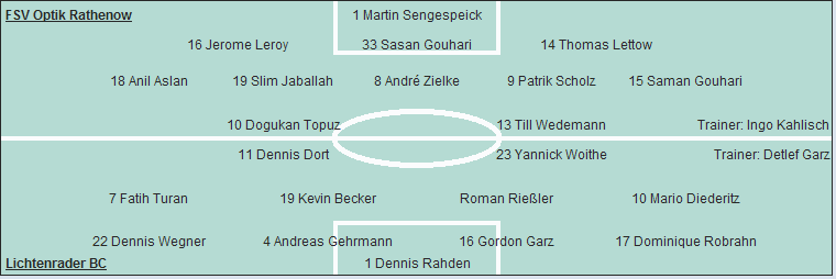 Lichtenrader BC: Dennis Rahden - Dominique Robrahn, Gordon Garz, Andreas Gehrmann, Dennis Wegner (73. Uria Wuttke) - Mario Diederitz (62. Marco Weller), Roman Rießler, Kevin Becker, Fatih Turan (57. Marcel Heimann) - Yannick Woithe, Dennis Dort