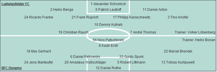Ludwigsfelder FC: Alexander Schostock - Heiko Bengs (67. Maximilian Schmidt), Patrick Leutloff, Daniel Anton - Ricardo Franke (62. Ardeshir Dejagah), Frank Ruprich (80. Andreas Toth), Philipp Karaschewitz, Tino Knöfel - Dennis Kutrieb - Christian Rauch, André Thomas
