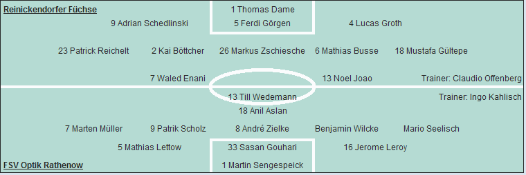 Reinickendorfer Füchse: Thomas Dame - Adrian Schedlinski, Ferdi Görgen, Lucas Groth (46. Danny Beier) - Patrick Reichelt, Kai Böttcher, Markus Zschiesche, Mathias Busse, Mustafa Gültepe - Waled Enani (62. Steven Haubitz), Noel Joao (46. Markus Mätschke)