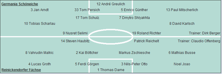Germania Schöneiche: André Greulich - Jan Arndt, Tom Persich, Enrico Günther, Paul Mitscherlich - Tom Schulz (46. Sebastian Creutzberg), Dmytro Shlyakhta - Tobias Scharlau, David Karlsch - Nusret Selimi, Roland Richter
