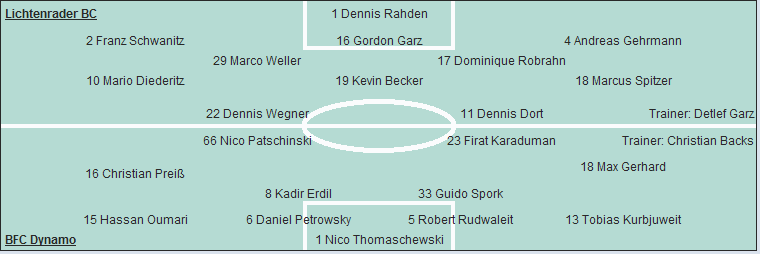 Lichtenrader BC: Dennis Rahden - Franz Schwanitz, Gordon Garz, Andreas Gehrmann - Marco Weller, Dominique Robrahn - Mario Diederitz, Kevin Becker (86. Marcel Heimann), Marcus Spitzer (64. Fatih Turan) - Dennis Wegner, Dennis Dort (77. Yannick Woithe)