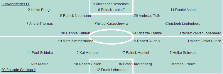 Ludwigsfelder FC: Alexander Schostock - Heiko Bengs, Patrick Leutloff, Daniel Anton - Patrick Neumann (61. Christian Rauch), Andreas Toth - André Thomas, Philipp Karaschewitz (81. Ringo Hebestadt), Christoph Lindenberg (66. Tino Knöfel) - Dennis Kutrieb, Ricardo Franke